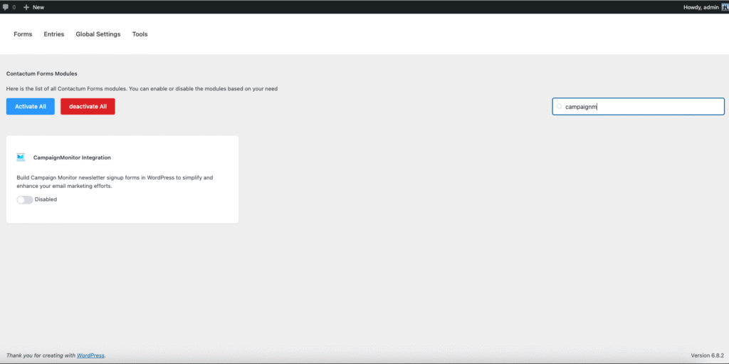 By integrating Campaign Monitor with Contactum, you can seamlessly send contact information from your WordPress site to your Campaign Monitor account each time a form is submitted.
