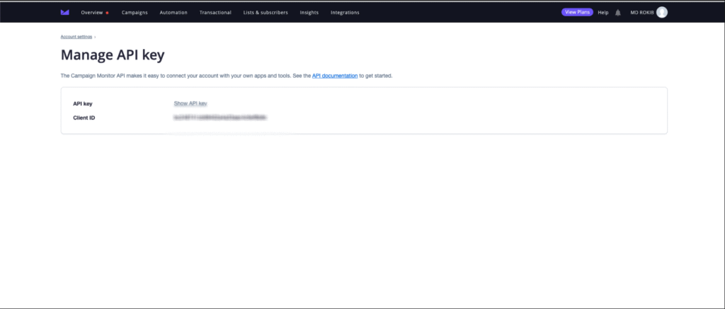 To get the Campaign Monitor API Key, log in to your Campagin Monitor account, go to the top-right corner, and click Profile.
