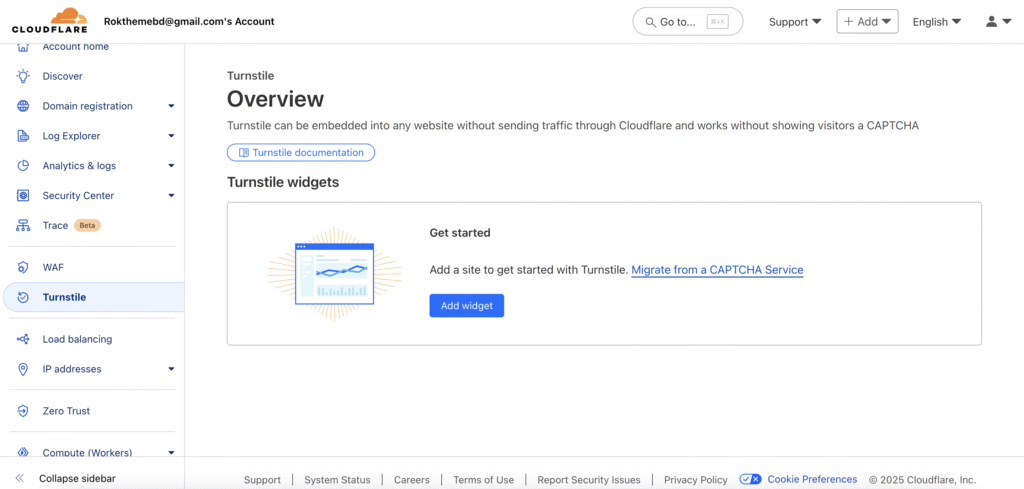 First, log in to your Turnstile account, go to Turnstile in the left-side menu, and click the Add Widget button.