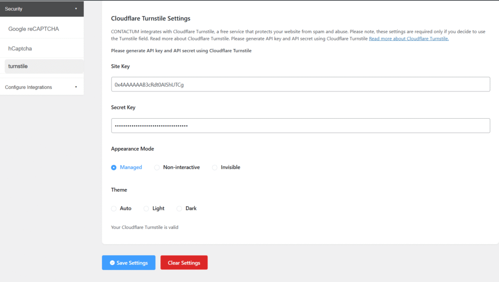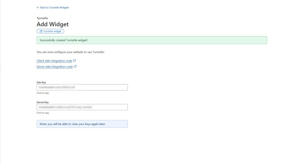 You will then need to enter the Site Key and Secret Key from your Turnstile account to complete the setup.
