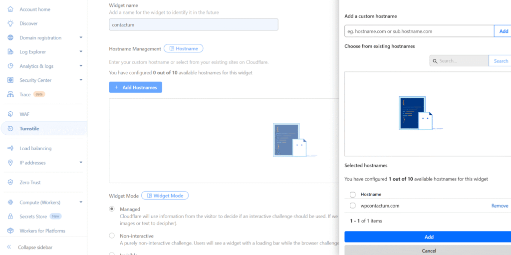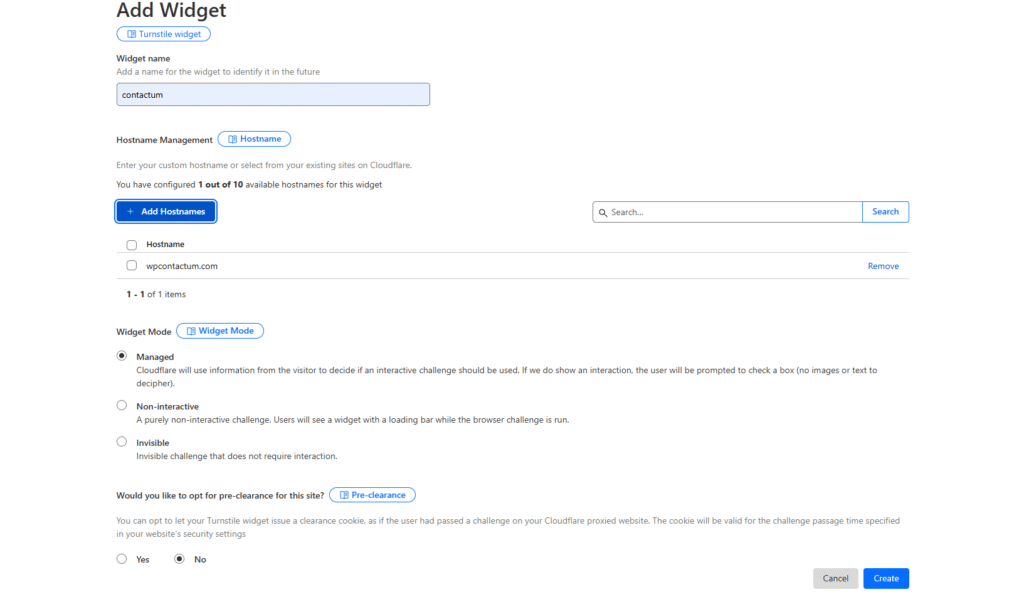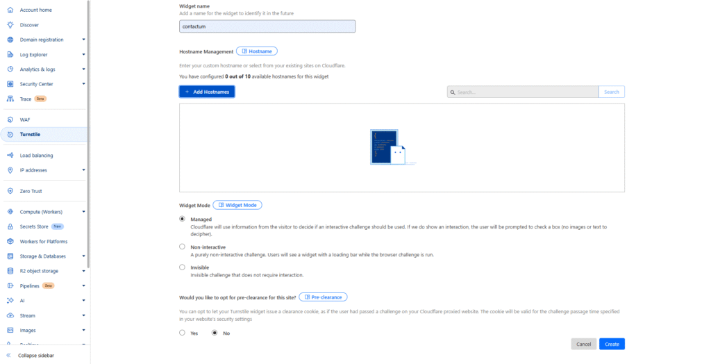 Now, put a Name to identify your website in the future and enter your website/s address using the + Add Hostnames button to register your domain for Turnstile verification.