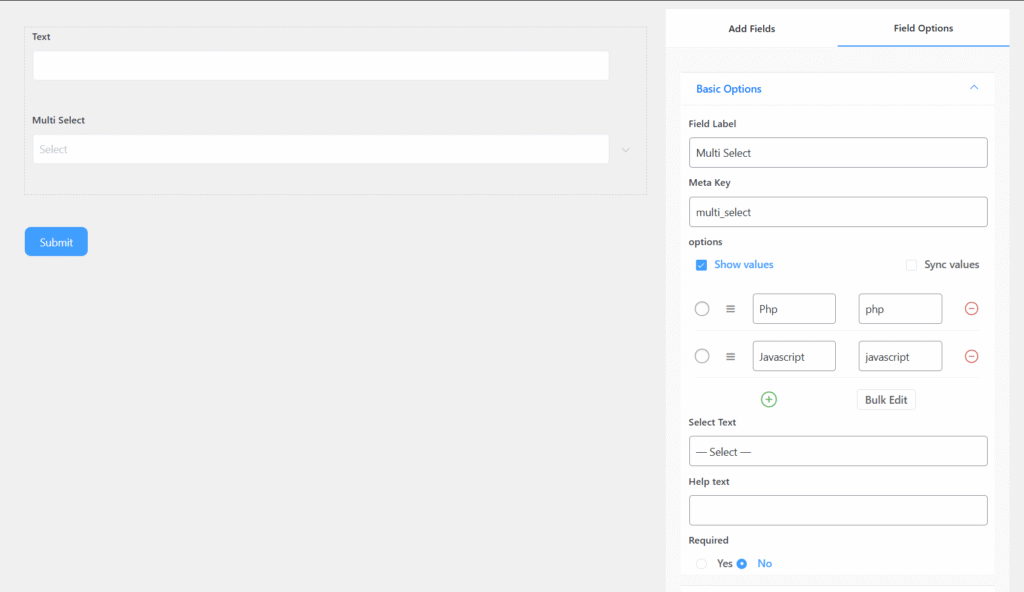 You can access the advanced options located just below the “Required” setting of the Mulitple Dropdown Field.